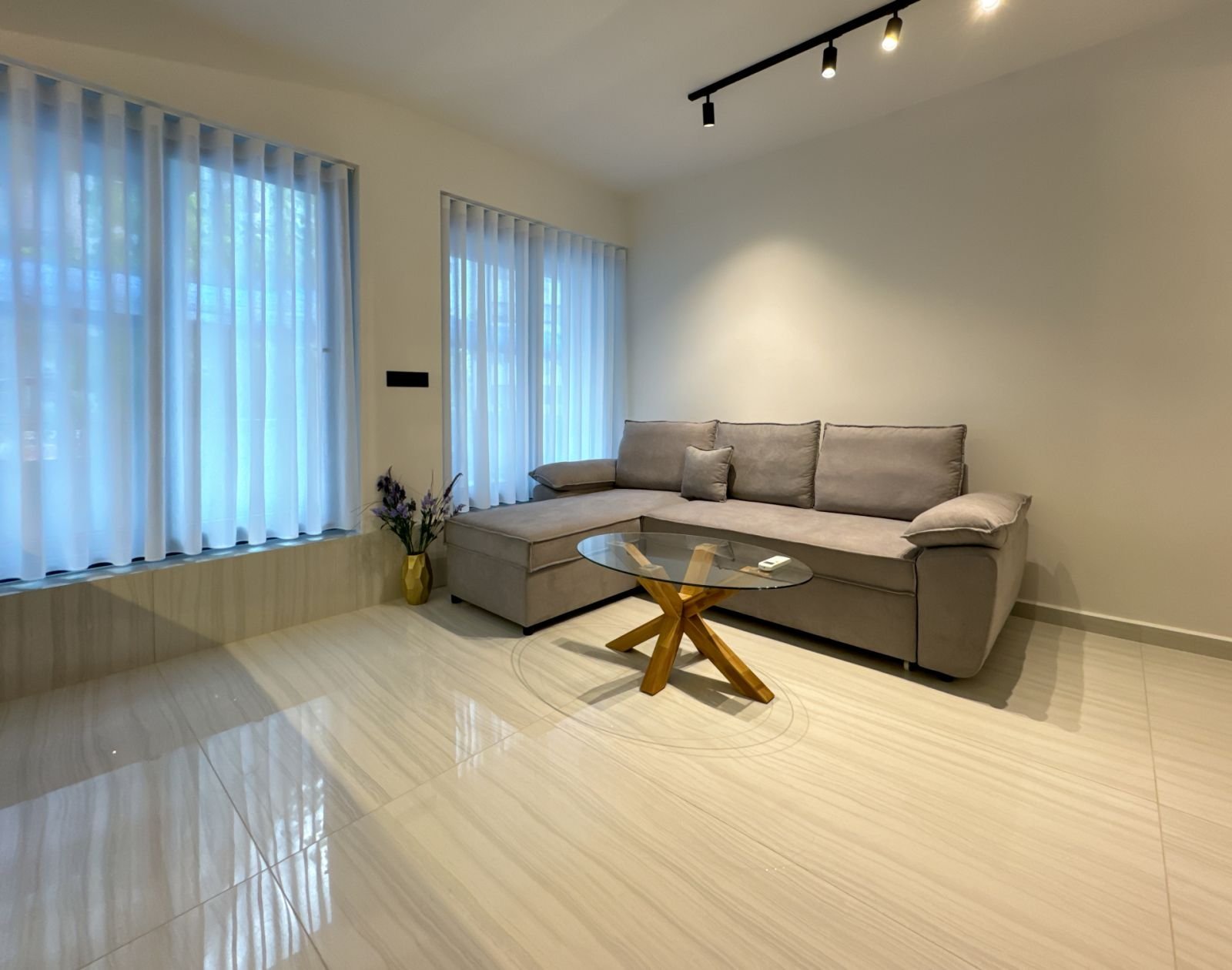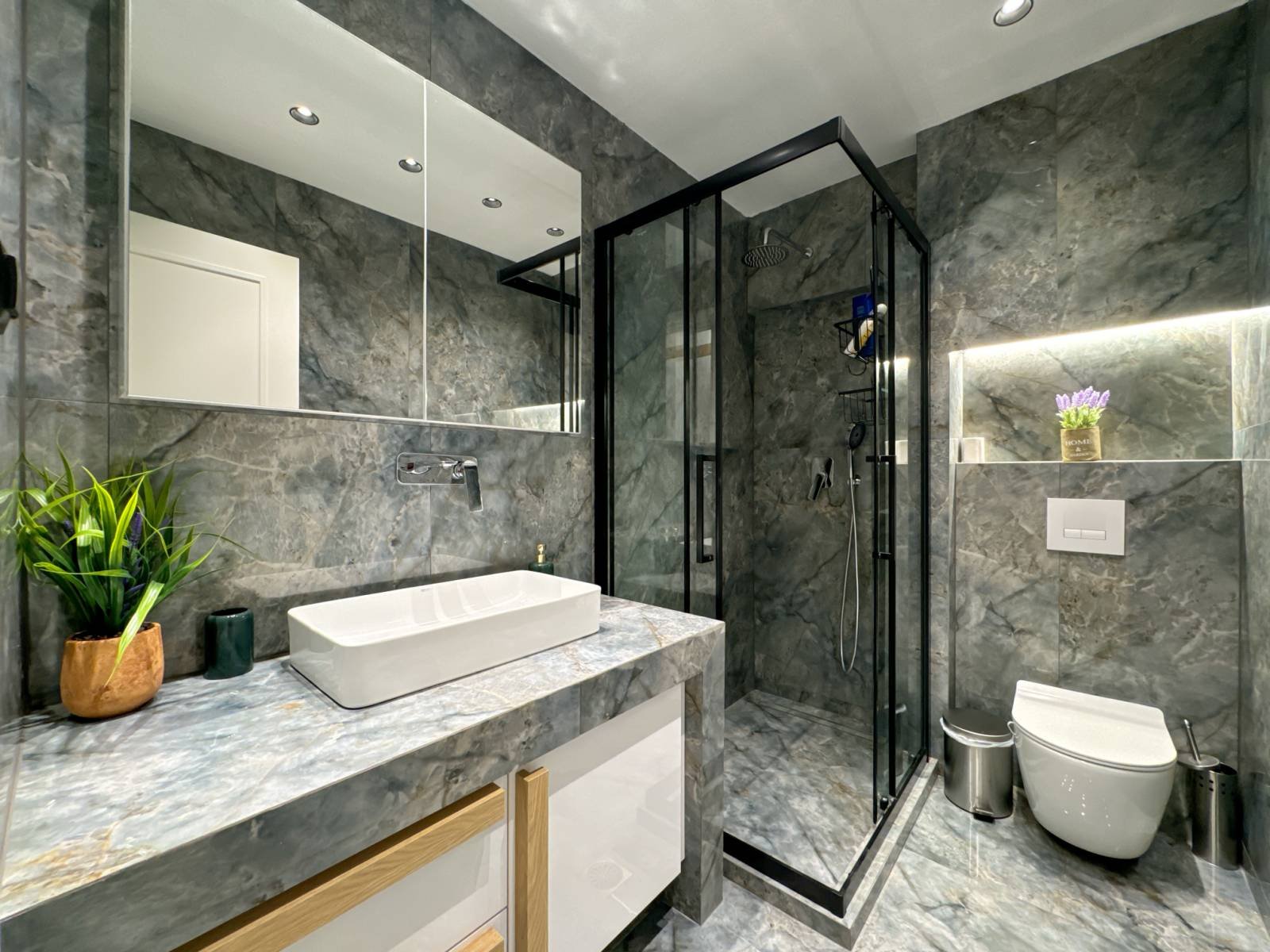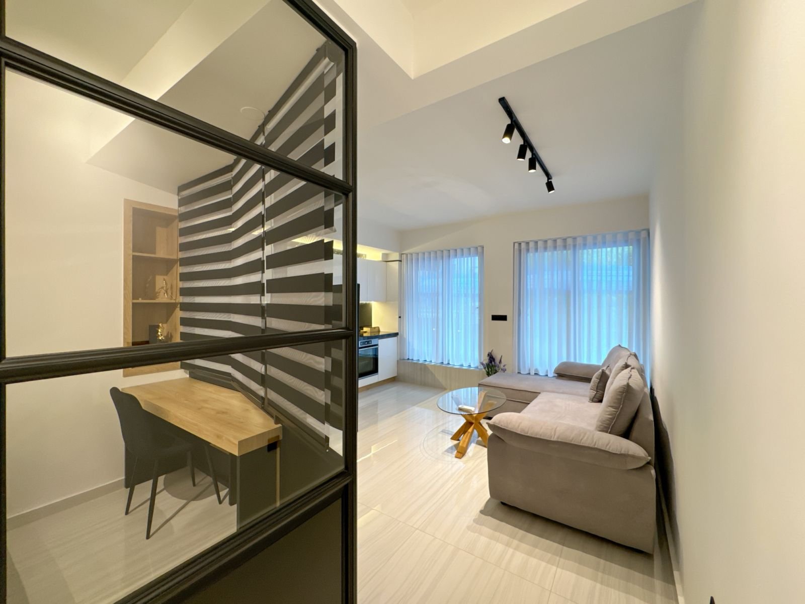 Έγινε ολική αναδιαμόρφωση του χώρου με πολλά γκρεμίσματα και προσθήκες. Εγκαταστάθηκαν εκ νέου υδραυλικά και ηλεκτρολογικά συστήματα. Τοποθετήθηκαν πλακίδια και μάρμαρα. Πραγματοποιήθηκε κατασκευή ειδικού χωρίσματος ώστε να η σαλοκουζίνα να χωριστεί από την κρεβατοκάμαρα. Έγιναν και οι απαραίτητοι ελαιοχρωματισμοί. Το μπάνιο έγινε, με μεράκι, εξ ολοκλήρου από την εταιρία μας, όπως και η επίπλωση της κουζίνας. Τον εξοπλισμό που χρειάζεται ένα ενοικιαζόμενο βραχυχρόνιας μίσθωσης το επιμελήθηκε η εταιρεία μας.
